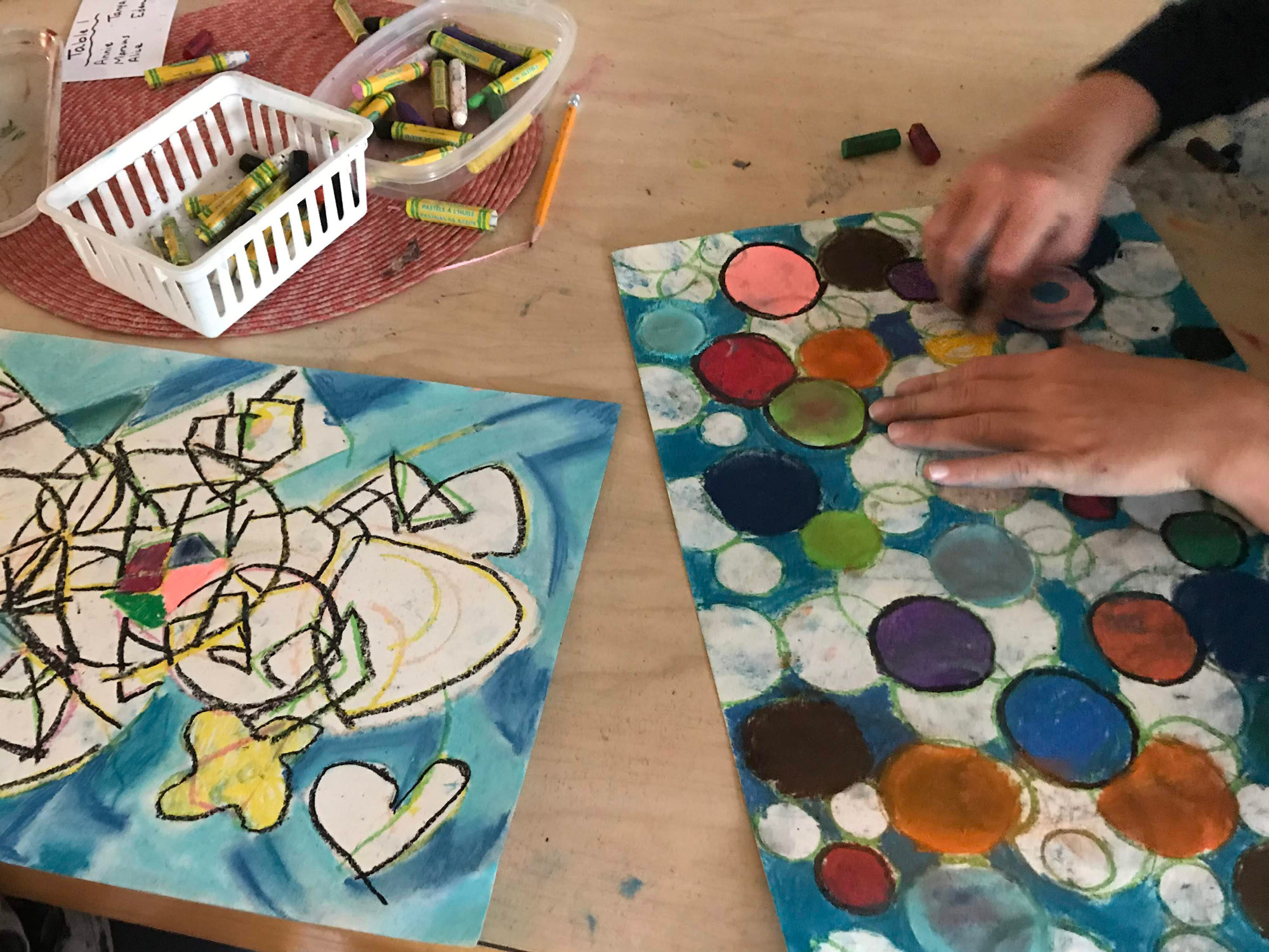 Integrated and comprehensive, our art curriculum was developed in-house and aligns with Montessori principles, serving students from Primary through Middle School. We encourage children to embrace the medium through engaging, educational, and fun lessons that utilize a vast variety of materials and techniques. Classes uniquely integrate core curriculum subjects and result in multi-faceted, interdisciplinary projects. Our Kandinsky-inspired Abstract Compositions are a prime example of an elementary project that ties in multidisciplinary components! We started by reading a children’s book about the artist Kandinsky, practiced a creative writing element, incorporated geometry and math ideas, all while learning about abstract art and how to work with oil and chalk pastels.